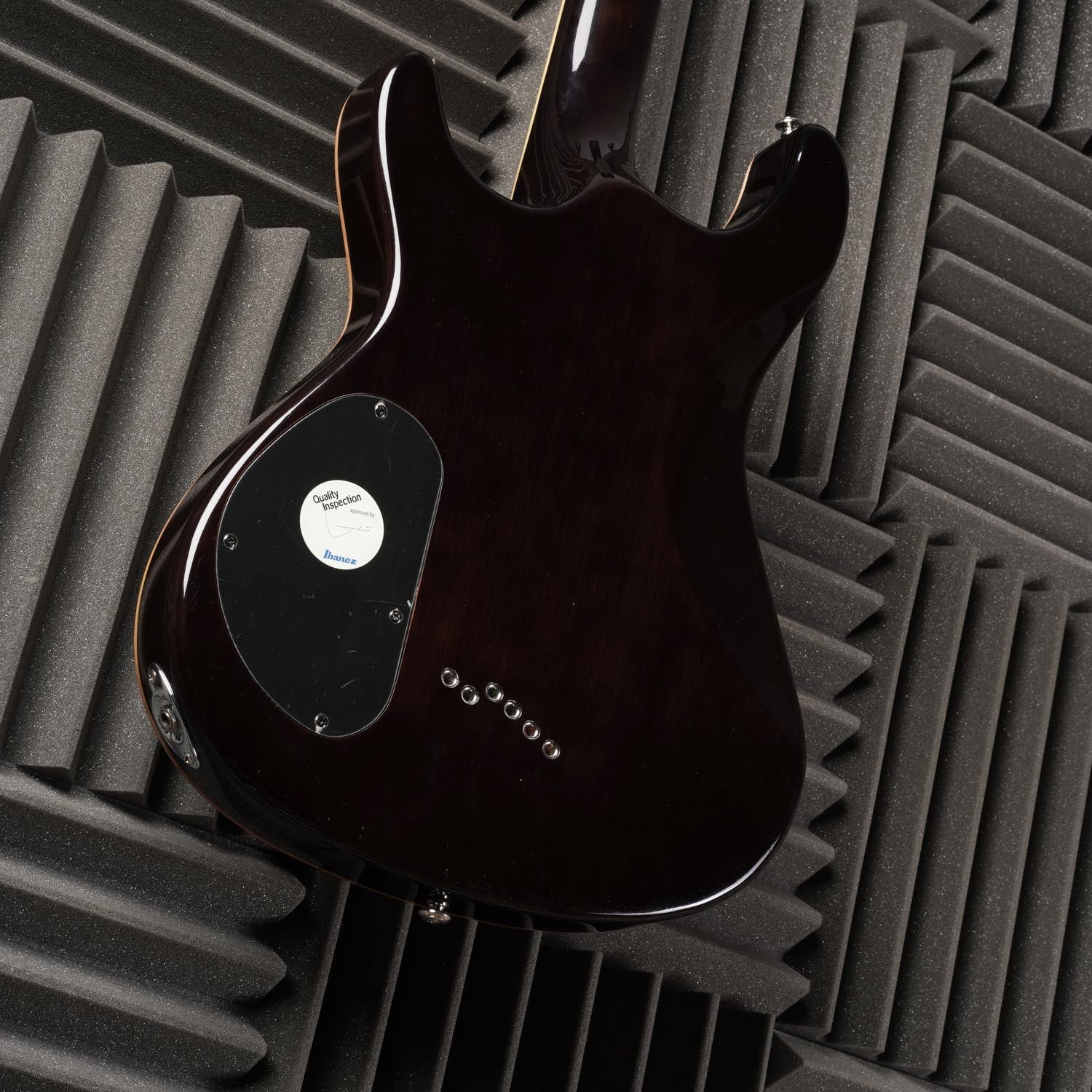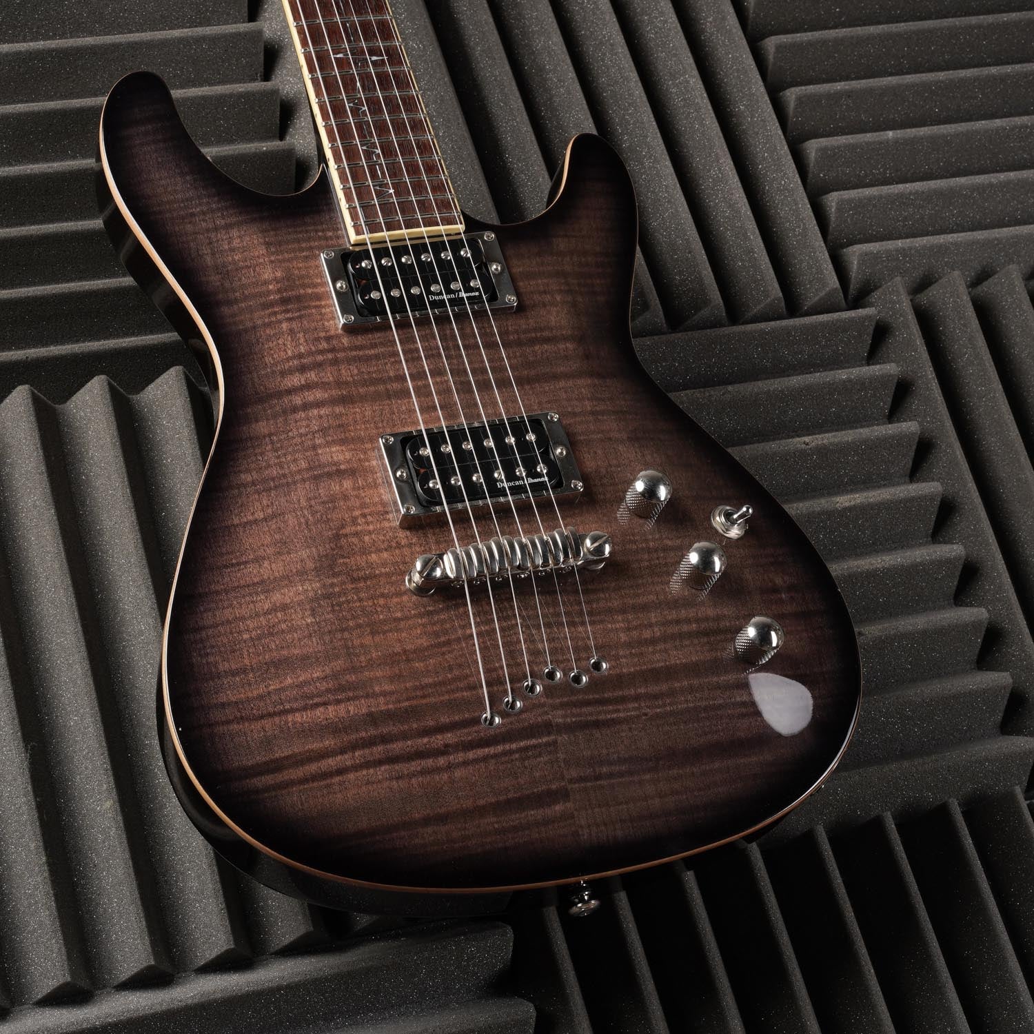 The SZ520FM features a flamed maple top on a mahogany body mated to a set-in mahogany neck with a 22-fret rosewood fretboard with binding and special EKG-style "heartbeat" position markers. Components include a pair of humbucking pickups made by Ibanez and designed by Seymour Duncan with individual volume controls, a Gibraltar III fixed bridge with staggered through-body stringing arrangement for superior tonal balance, Ibanez die-cast tuners and knurled control knobs.