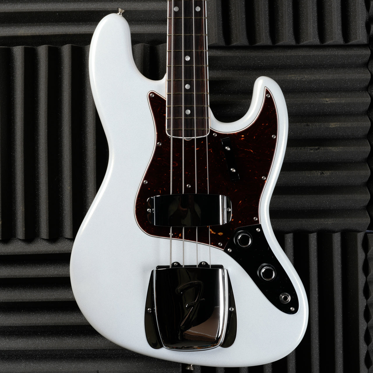 The 60th Anniversary Jazz Bass honors and elevates the original design. Two Pure Vintage '62 pickups deliver the bell-clear highs and deep, musical low-end that make the J-Bass® a staple for any genre. A pair of concentric volume and tone controls allow complete command over the blend and character of each pickup - a feature first found on the very earliest J-Bass models from 1960 to 1962. Other features include an alder body and maple neck with a bound rosewood fingerboard, bone nut, vintage-correct 7.25" radius, vintage tall frets, and a fast and comfortable '60s "U" profile. The lacquer finish in Arctic Pearl is complemented by the tortoiseshell pickguard, white binding on the neck and matching headcap, making the 60th Anniversary Jazz Bass an unforgettable modern classic. Also included are a deluxe vintage-style case with 60th anniversary embroidery and certificate of authenticity.