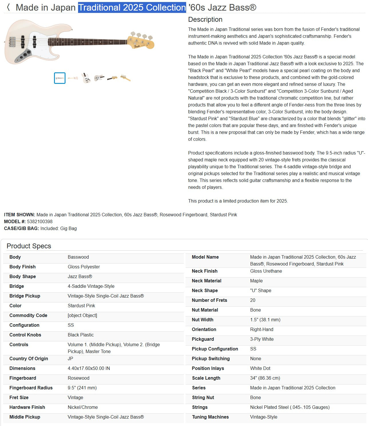 The Made in Japan Traditional 2025 Collection '60s Jazz Bass® is a special model based on the Made in Japan Traditional Jazz Bass® with a look exclusive to 2025. The "Black Pearl" and "White Pearl" models have a special pearl coating on the body and headstock that is exclusive to these products, and combined with the gold-colored hardware, you can get an even more elegant and refined sense of luxury. The "Competition Black / 3-Color Sunburst" and "Competition 3-Color Sunburst / Aged Natural" are not products with the traditional chromatic competition line, but rather products that allow you to feel a different angle of Fender-ness from the three lines by blending Fender's representative color, 3-Color Sunburst, into the body design. "Stardust Pink" and "Stardust Blue" are characterized by a color that blends "glitter" into the pastel colors that are popular these days, and are finished with Fender's unique burst. This is a new proposal that can only be made by Fender, which has a wide range of colors.